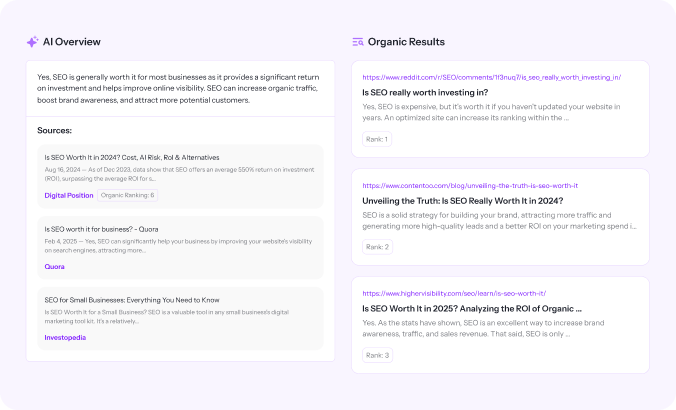 AI Overviews don’t automatically feature the #1 ranked page. Instead, the AI searches for the clearest and most direct answer it can find. This means it might choose a competitor’s page if it has a simple paragraph or bulleted list that’s easier to quote. Our AI Overview Checker shows you exactly who was featured and what format they used.